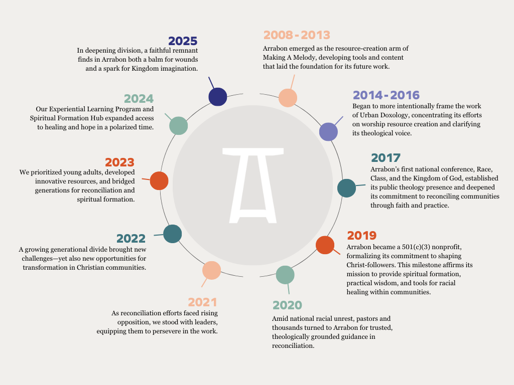 Racial brokenness is present throughout American history and present-day realities. We know that broken things do not heal on their own. When Christ-followers are absent from the work of racial healing, we lose the opportunity to proclaim and demonstrate the gospel of reconciliation. Arrabon equips Christ-followers to live into their calling to be ambassadors of reconciliation.